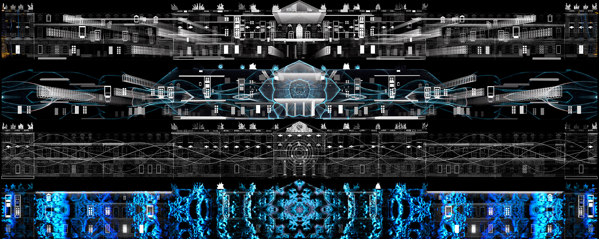 La fachada se convierte en una superficie activa donde las ondas se propagan, colisionan y resuenan. Las frecuencias se alinean y amplifican, generando deformaciones, atracciones de carácter magnético y tensiones espaciales que sugieren que el propio edificio responde a energías invisibles. Mediante un control preciso de la luz y la sombra, las proyecciones bidimensionales simulan formas volumétricas, creando la ilusión de profundidad y movimiento integrados en la estructura arquitectónica.